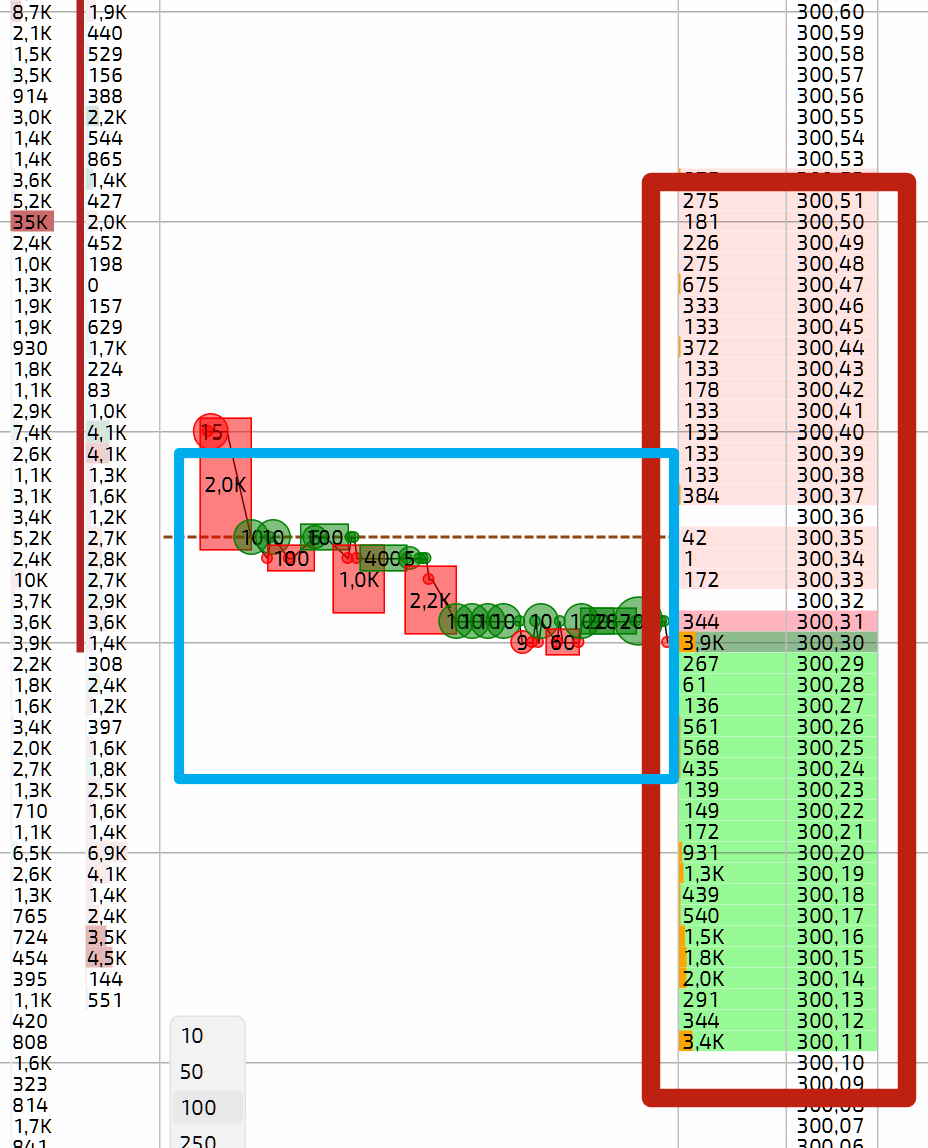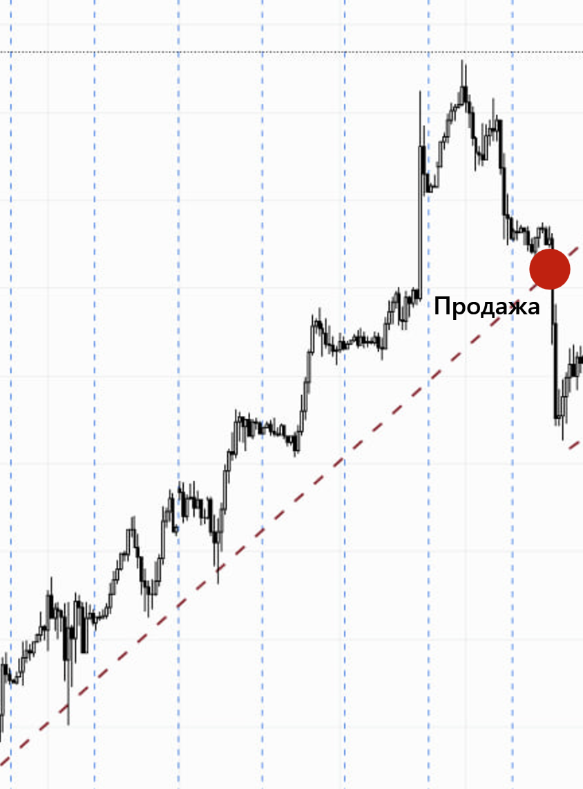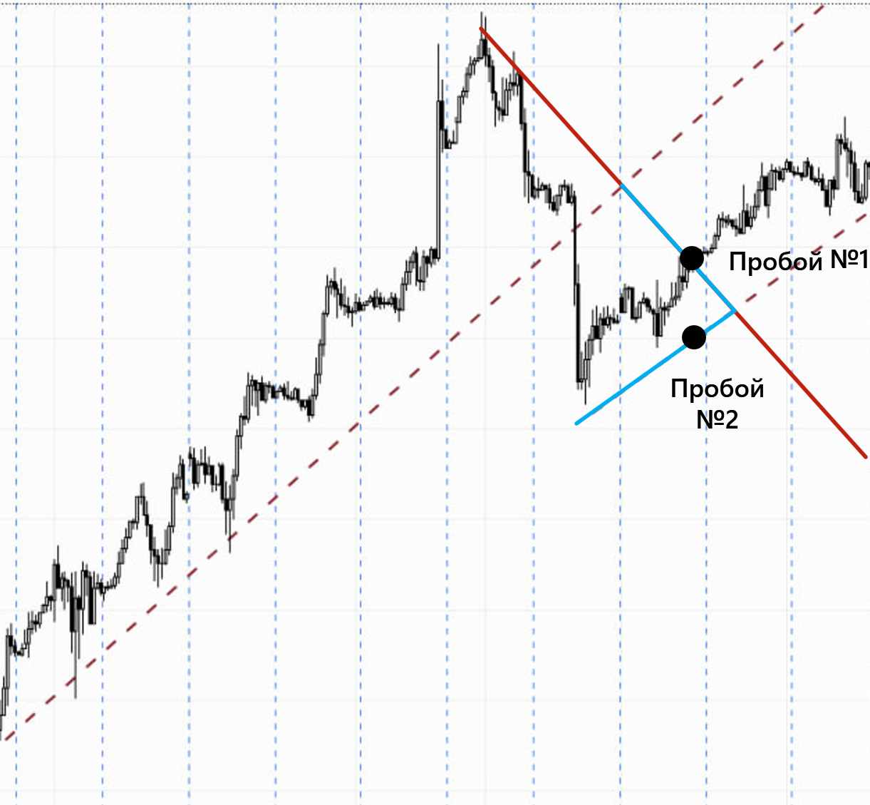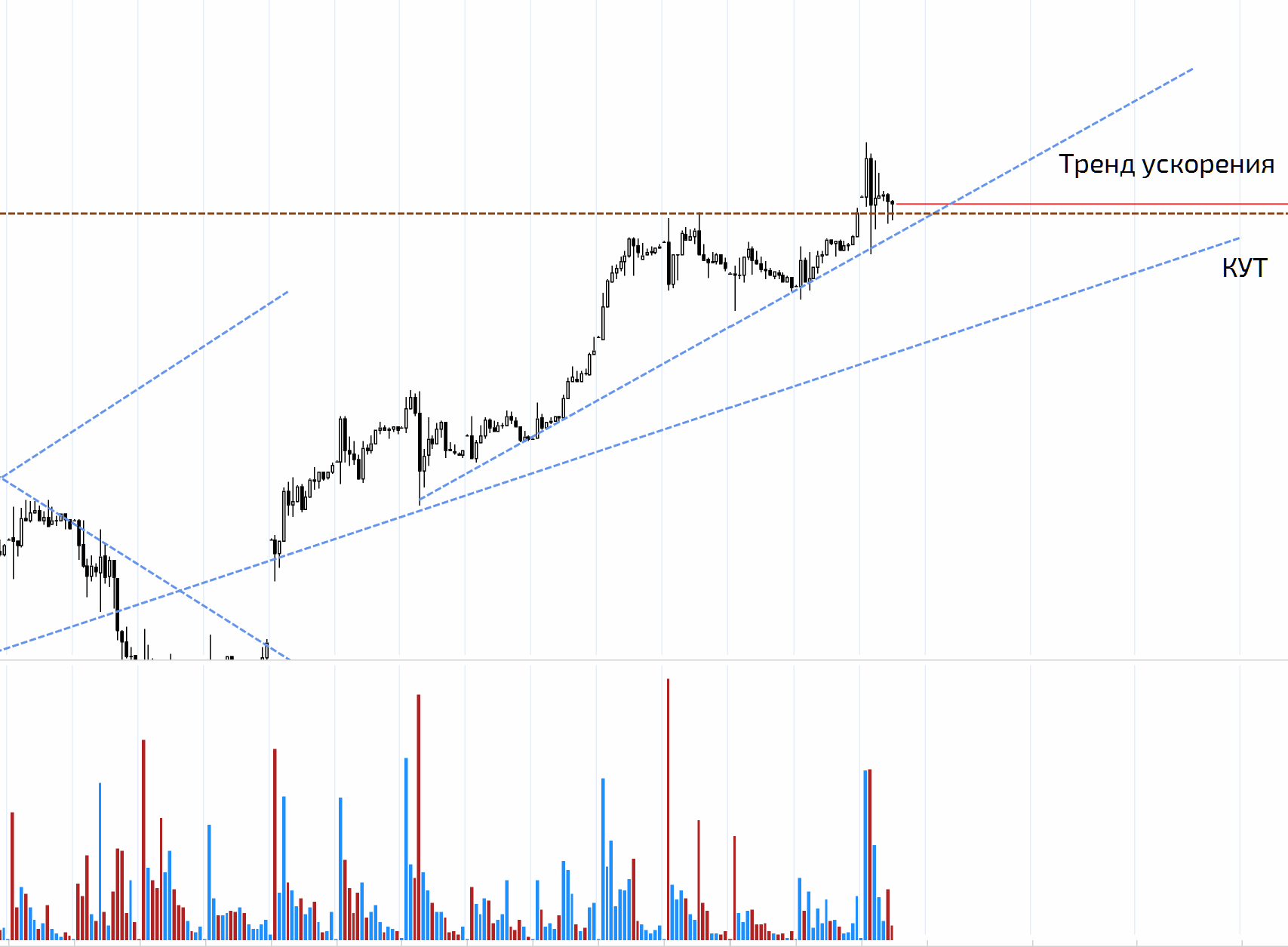 В точке интереса (пробой КУТ) масса участников заходят в пробой тем самым дополнительно стимулируют выход цены за КУТ. После этого на рынке появляются барьеры в виде лимитных заявок в биржевом стакане и активация рыночных продаж.