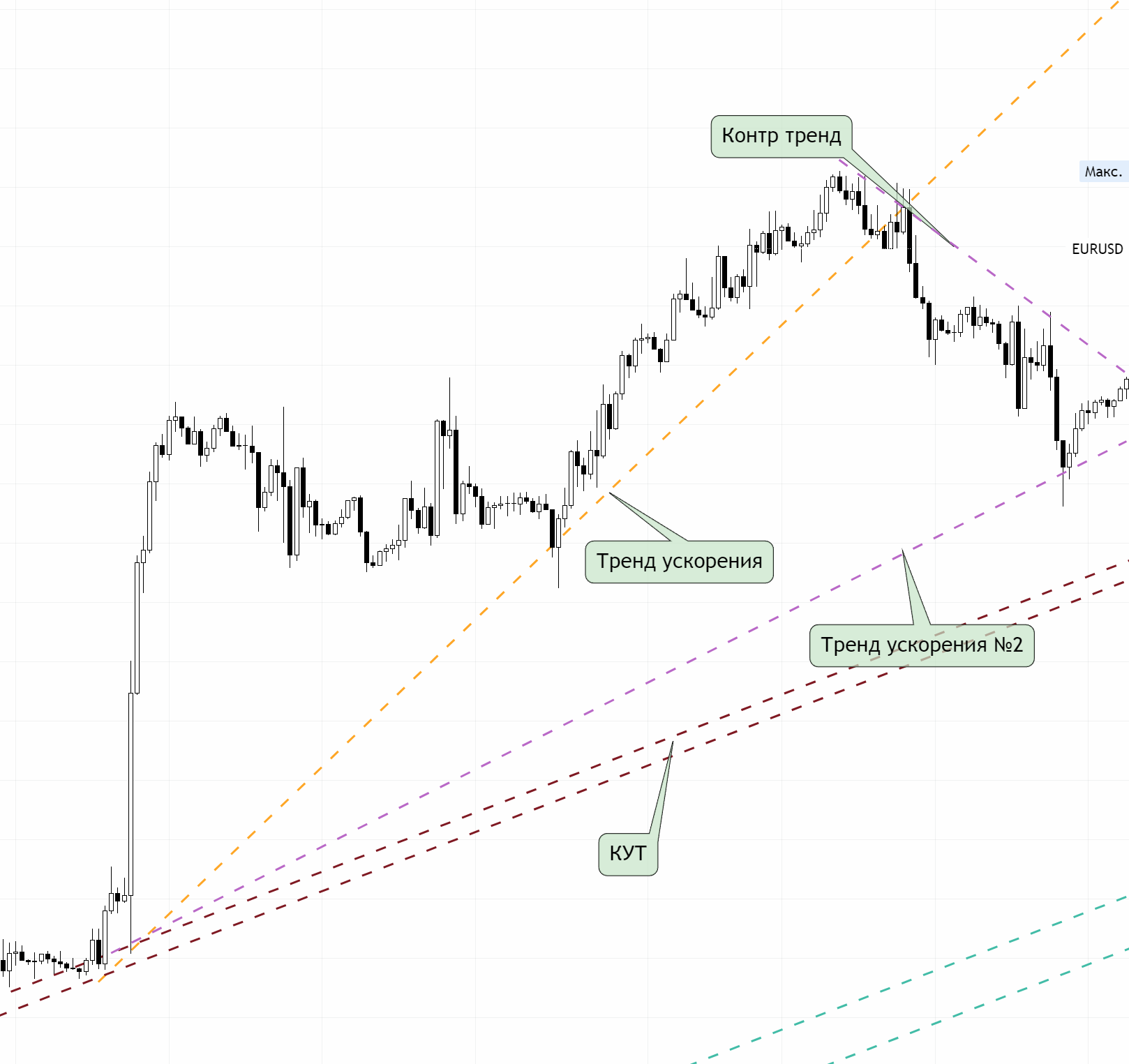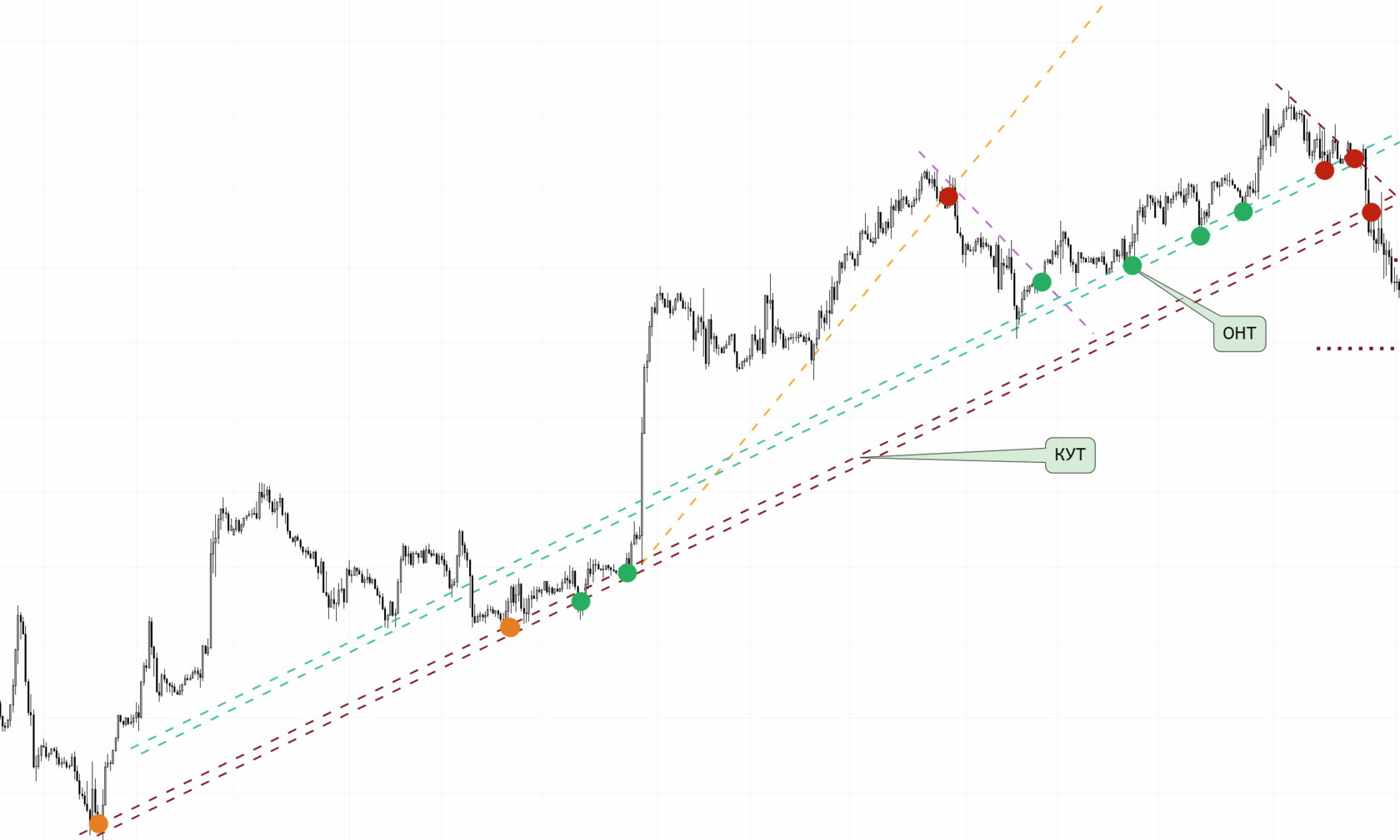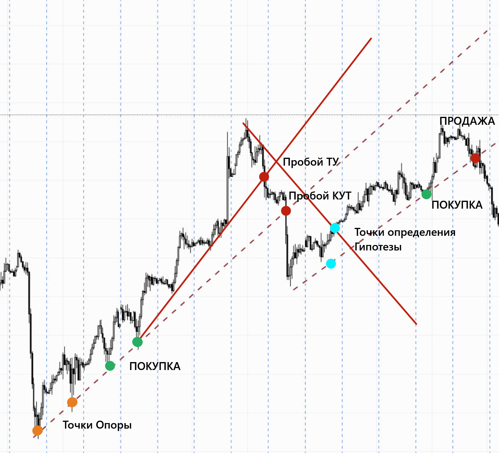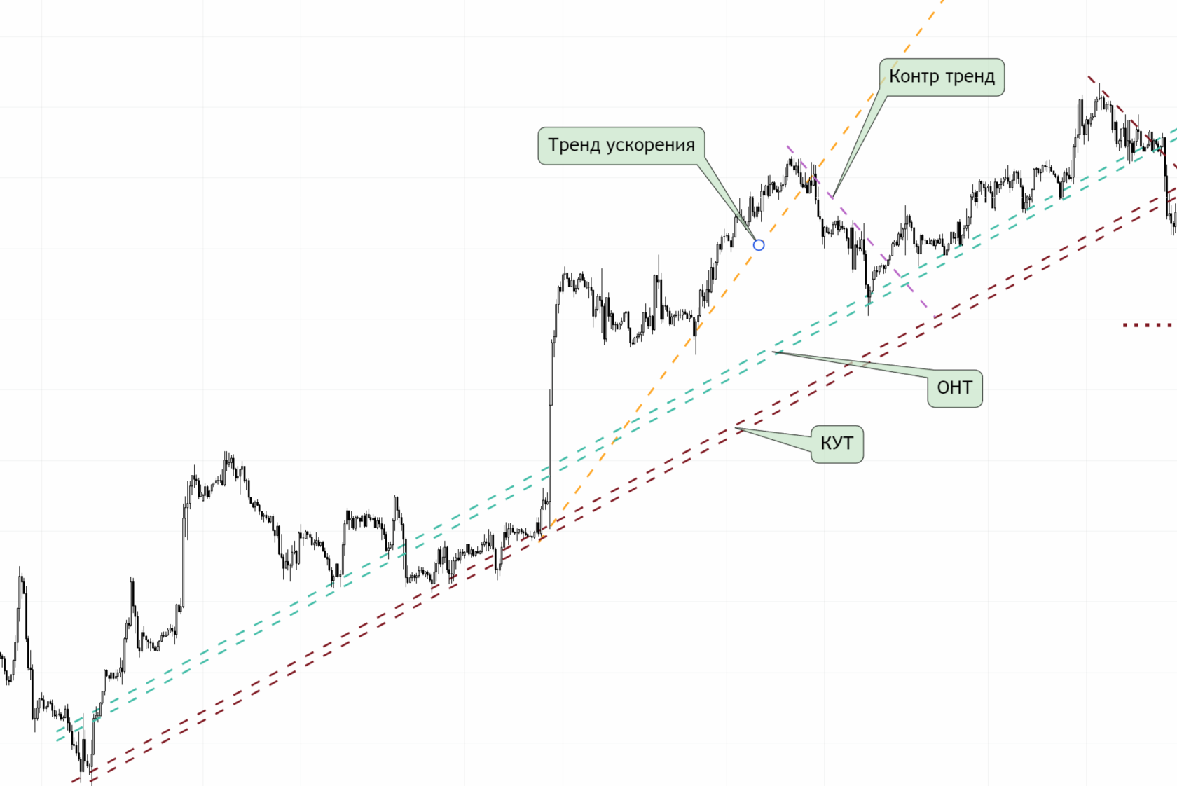 - КУТ материнского тренда выполняет функцию противоположного канала и служит основанием для входа в сделку (то есть в отличии от клонической модели торговли у нас не однонаправленные сделки а разнообразные в зависимости от нахождения цены)
