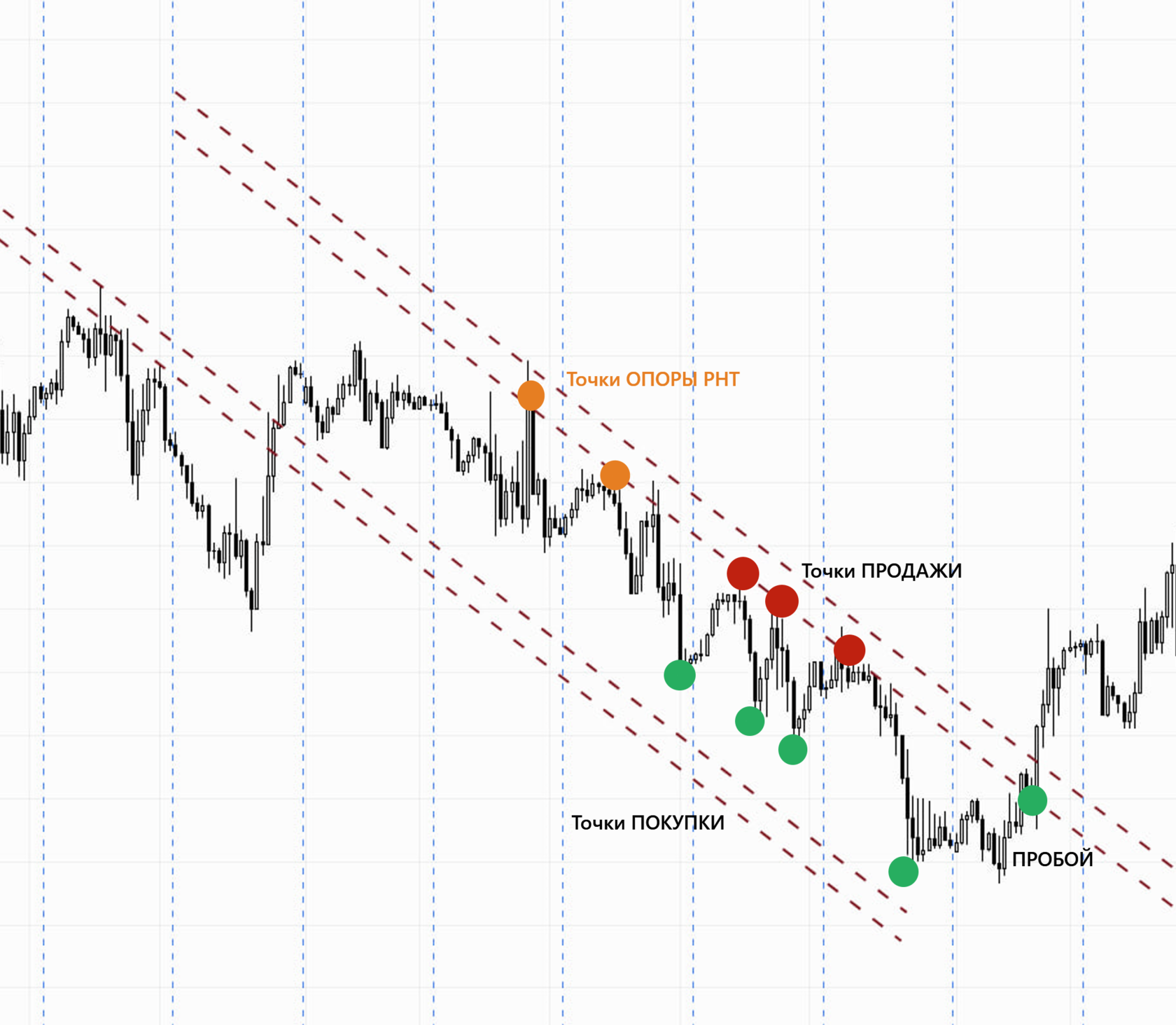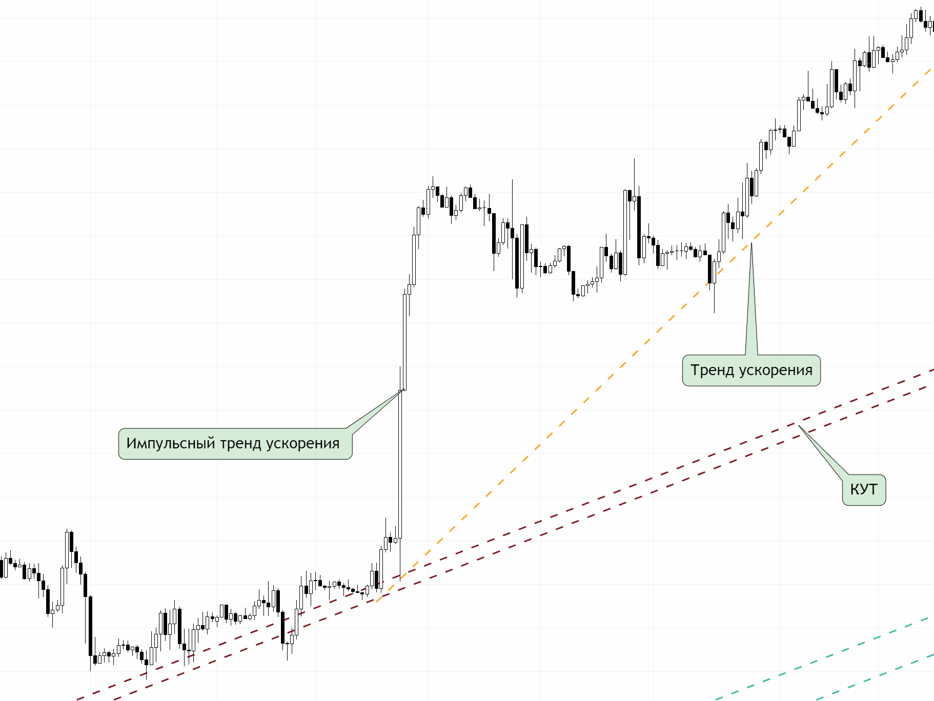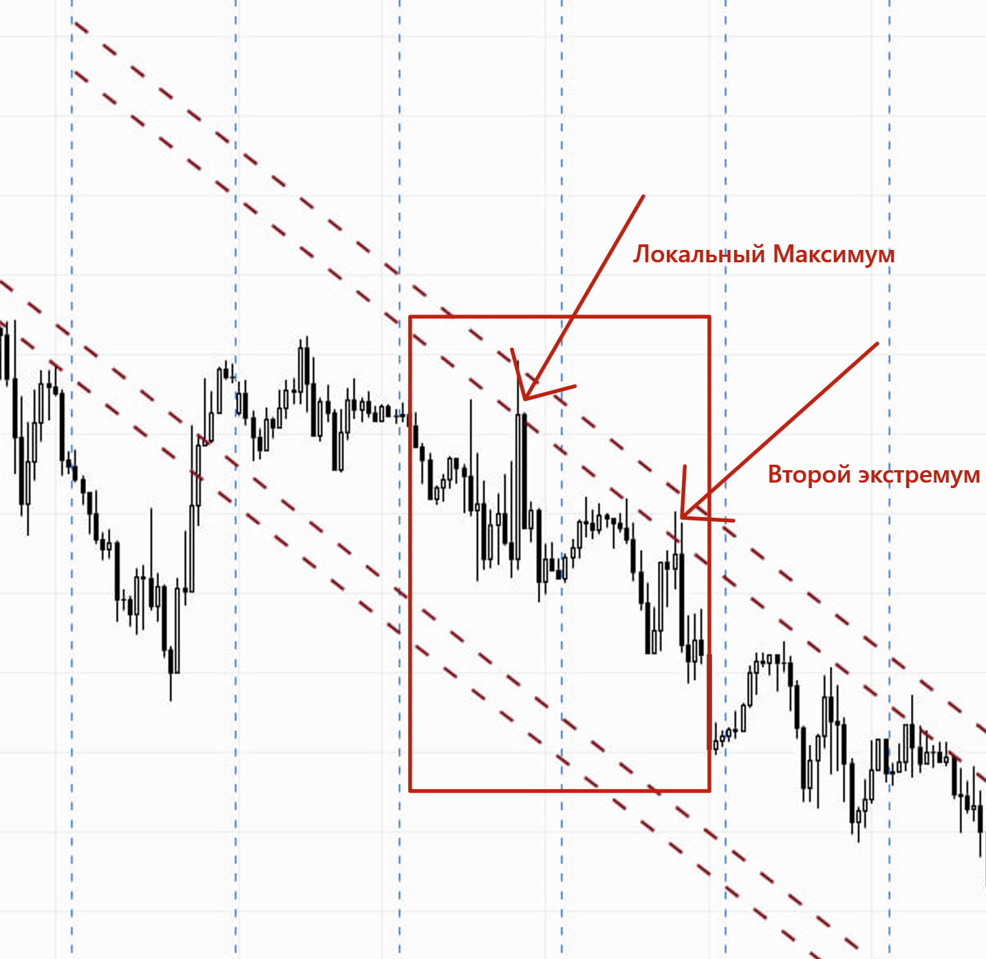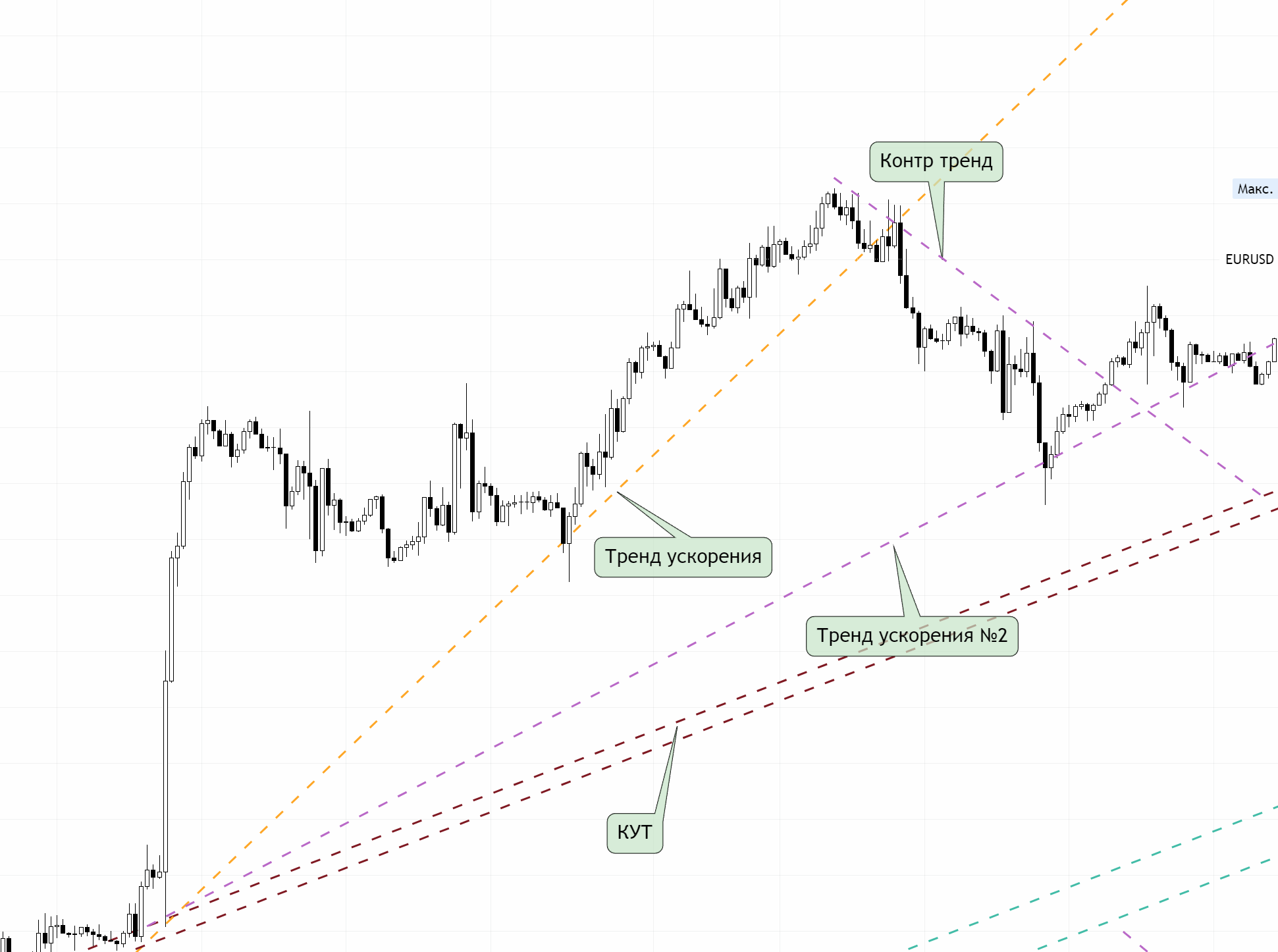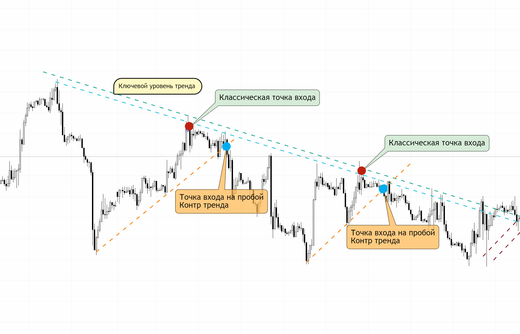 - КУТ материнского тренда выполняет функцию противоположного канала и служит основанием для входа в сделку (то есть в отличии от клонической модели торговли у нас не однонаправленные сделки а разнообразные в зависимости от нахождения цены)