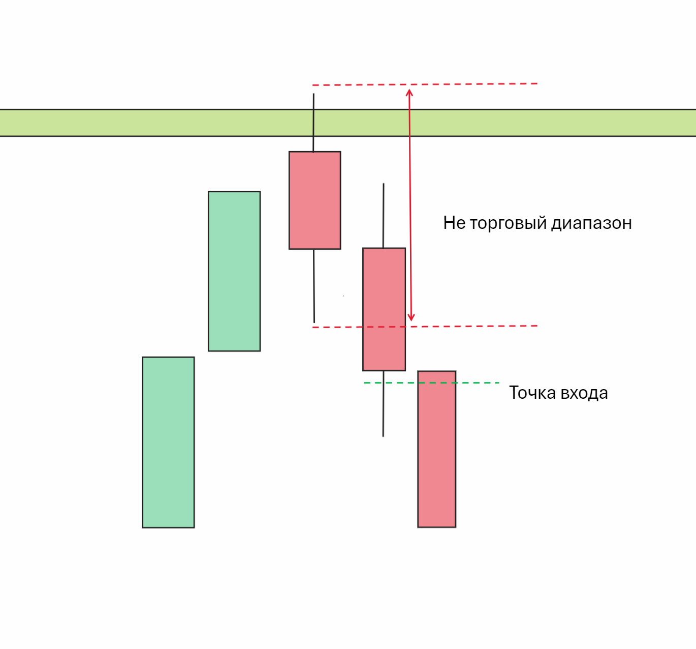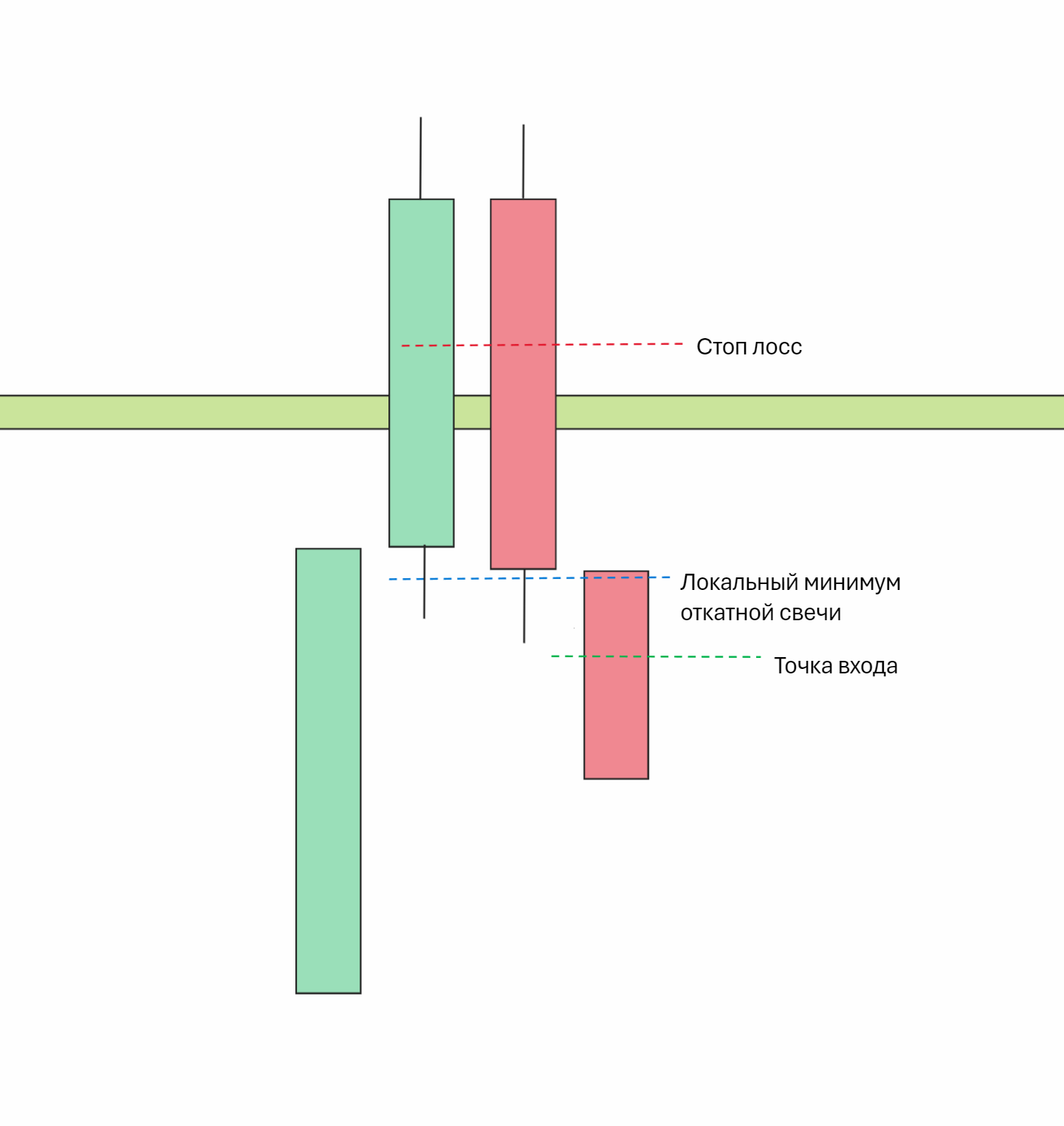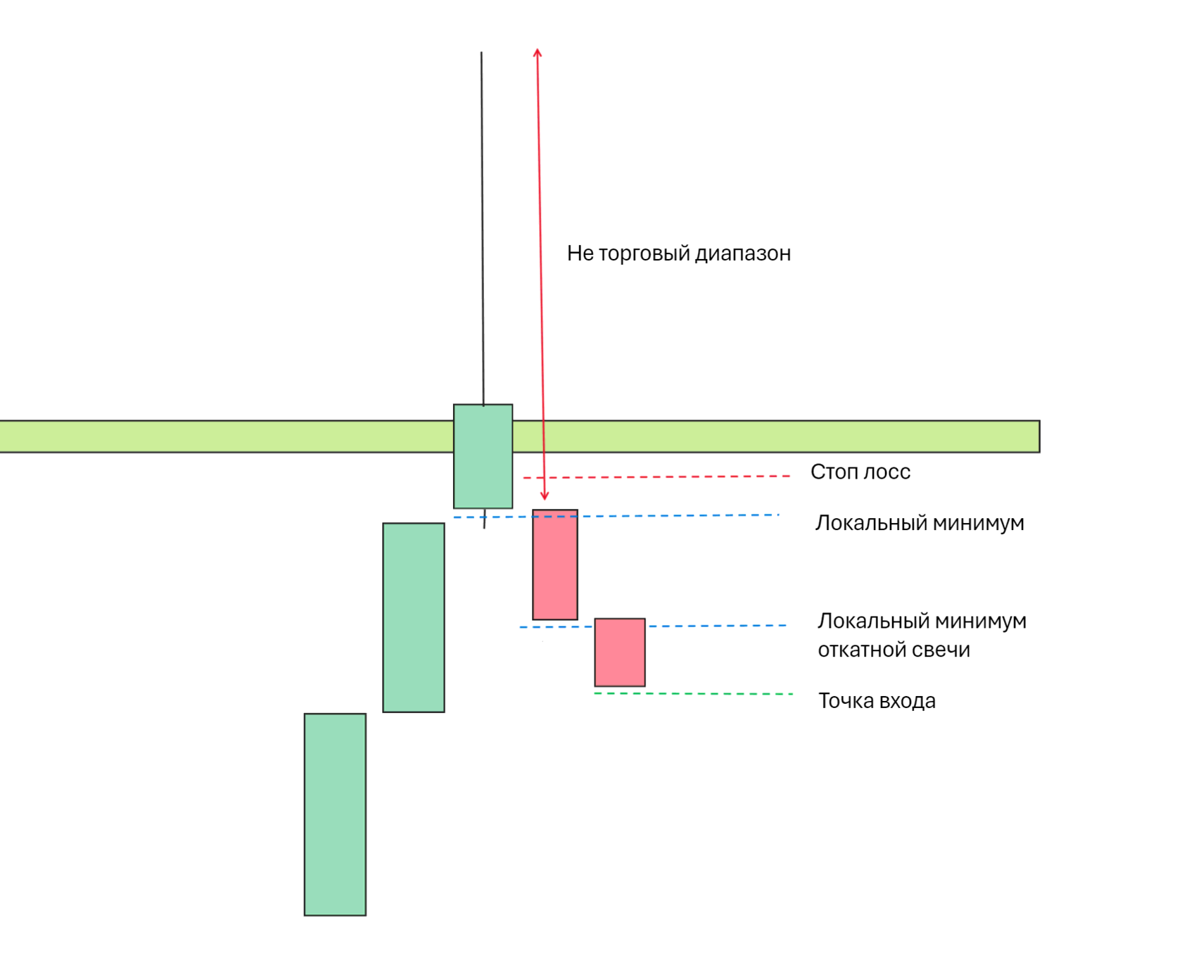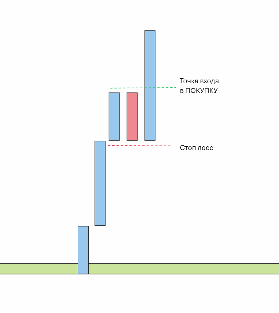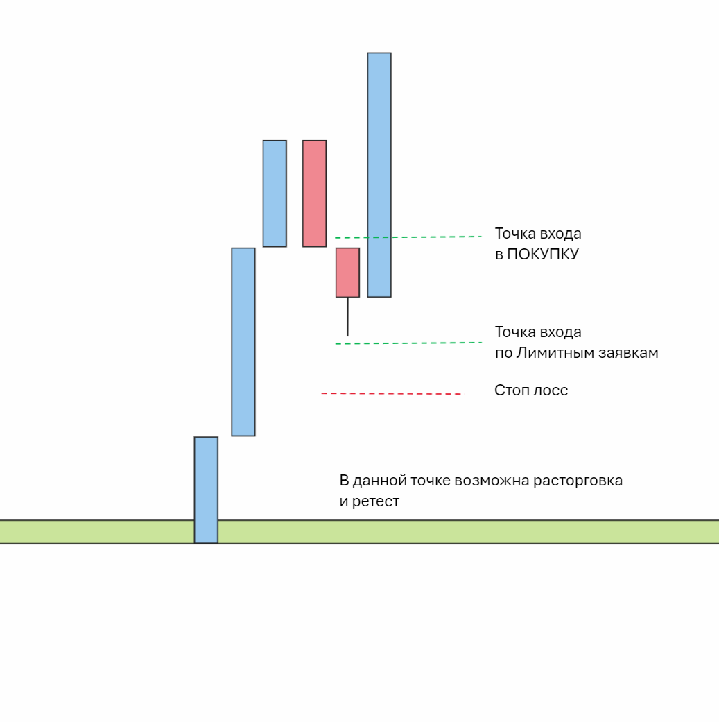 - Рекомендуется заходить на свече возобновления движения в точке входа (пример на картинке)