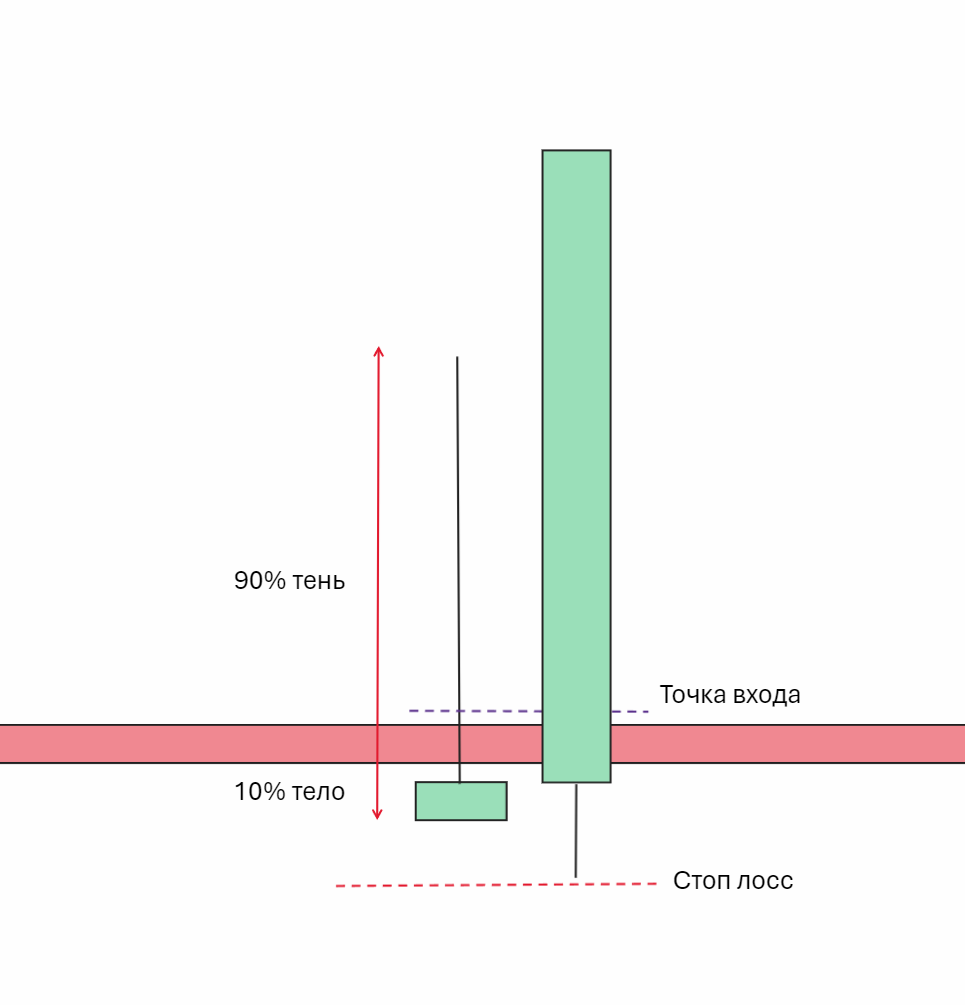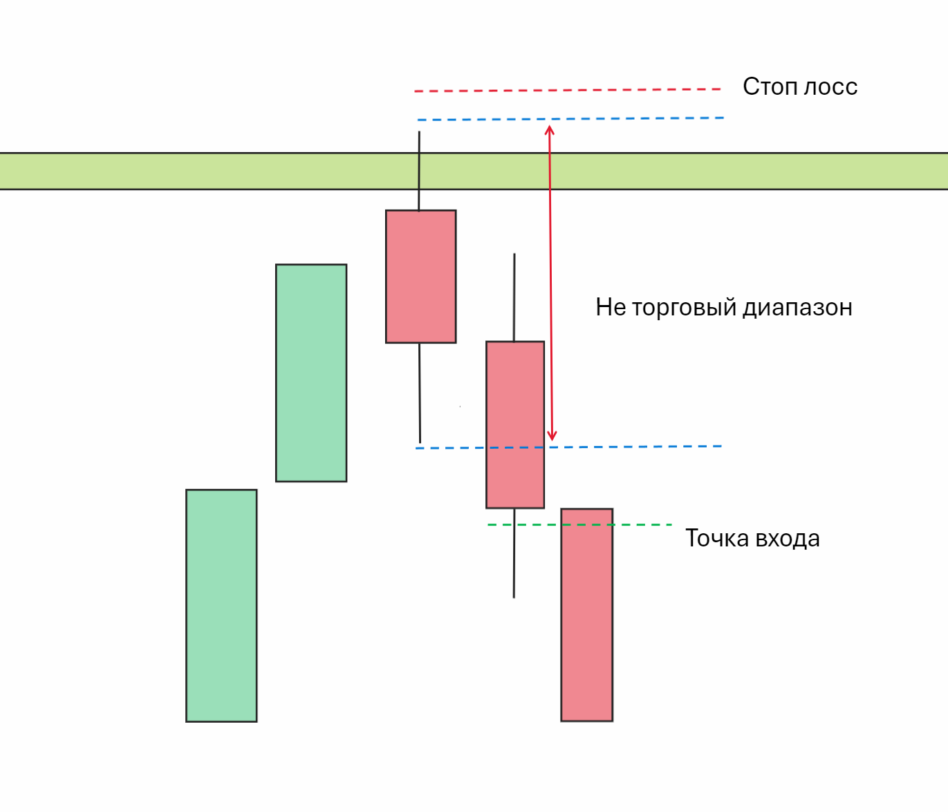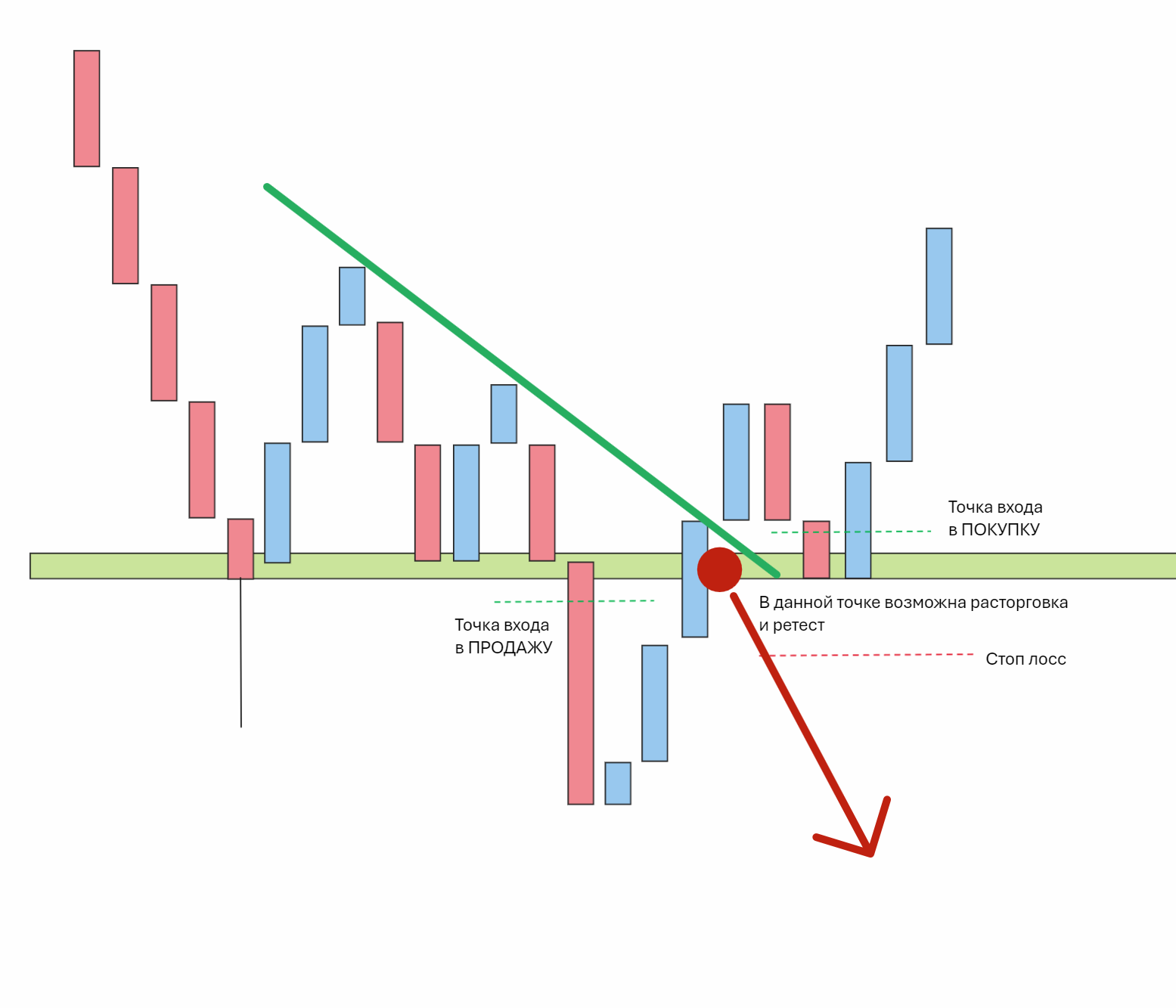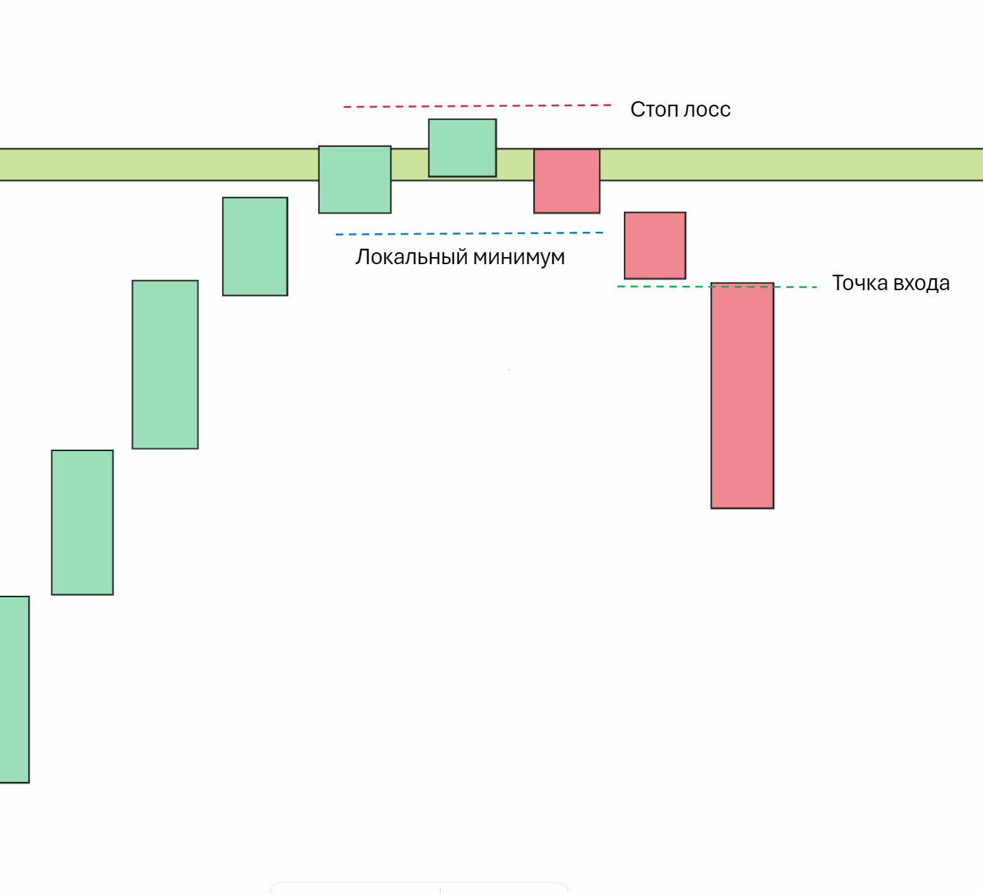 - Рекомендуется заходить на свече возобновления движения в точке входа (пример на картинке)